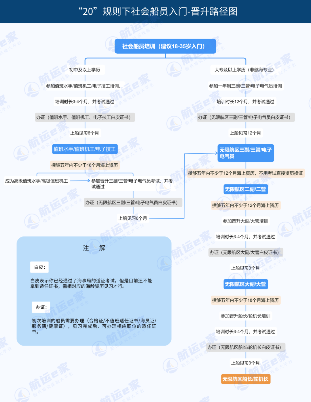 首先我们来看一个社会船员从入门到成为船长、轮机长的全晋升路径。